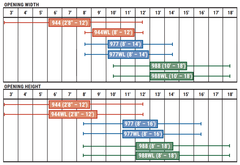 The 988WL is available in custom sizes from 10’0″ to 18’0″ widths and 10’0″ to 18’0″ heights.